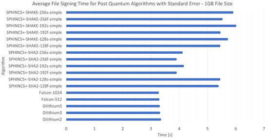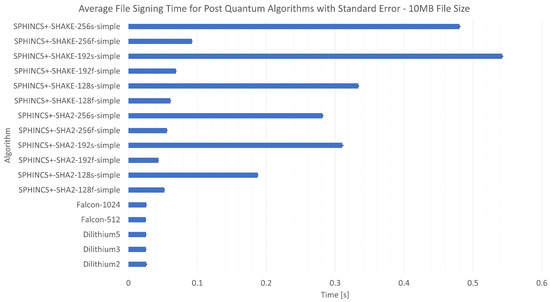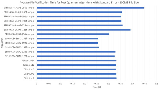 Figure 8, Figure 9 and Figure 10 show the average verification time for signed files of 10 MB, 100 MB, and 1 GB, respectively. Figure 8 referring to the case with the smallest file size presents that the Dilithium algorithms performed the worst, which is completely different from the previous results. In this case, the SPHINCS+SHA2-192 and SPHINCS+SHA2-256 algorithms achieved the best result. The SPHINCS+ algorithm based on the SHAKE hash function achieved comparable results regardless of the key size. In the operation involving a 100 MB file as shown in Figure 9, the SPHINCS+SHAKE-256s-simple algorithm recorded the longest duration. The trio of SPHINCS+SHA2 algorithms also showed slight variations. However, apart from that, the results were relatively comparable. The results shown in Figure 10 (1 GB file) were the most consistent across all evaluated scenarios. The outlier was a set of four algorithms from the SPHINCS+ group, specifically two variants each of SPHINCS+SHA2-192 and SPHINCS+SHA2-256, which recorded significantly improved results over the other tested examples. Nevertheless, the variance did not exceed 30% compared to other algorithms. The precise values are presented in Table 3 (key generation and signing) and Table 4 (verification of signatures).