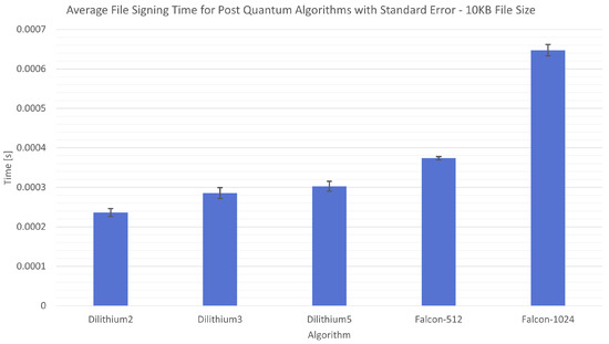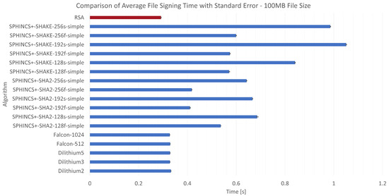 Figure 11, Figure 12 and Figure 13 present a comparison of the average file signing times of the post-quantum and RSA algorithms. Due to the complexity of post-quantum algorithms, a time overhead is expected compared to RSA. Examples with 100 MB and 1 GB file sizes meet this hypothesis, while an example with a 10 MB file size shows that a post-quantum algorithm can be even a bit faster than RSA. Looking at the full context of these three scenarios, it can be observed that differences are not overwhelming. The question then remains, is the significant security improvement worth the time overhead? Dilithium algorithms, including the best one—labelled Dilithium5, appear to be suitable candidates for replacing RSA. It has the NIST security level 5 declared by OpenQuantumSafe, while the tested version of RSA is estimated to be level 1. In the conducted measurements on the largest file (1 GB), Dilithium5 achieved an average result of 3.31 s, while RSA scored 2.56 s. This represents an overhead of approximately 27.7% in exchange for resistance to quantum cryptanalysis.