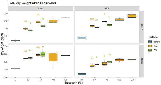 Total dry weight of the crop harvest of the ammonium sulfate (AS) (green) and calcium ammonium nitrate (CAN) treatments (orange) for two soils (clay and sand), two crops (grass and maize) and different levels of N dosages. The letters indicate groupings of the treatments determined by the least squares difference (LSD): two treatments with the same letter are not significantly different from each other. Grass and maize were analyzed separately and only 50% and 75% of the treatments were included in the statistical tests. LSD is 10.61 g pot−1 for grass and 4.71 g pot−1 for maize.