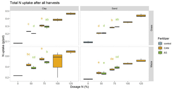 Total N uptake of the crop harvest of the ammonium sulfate (AS) (green) and calcium ammonium nitrate (CAN) treatments (orange) for two soils (clay and sand), two crops (grass and maize) and different levels of N dosages. The letters indicate groupings of the treatments determined by the LSD test: two treatments with the same letter are not significantly different from each other. Grass and maize were analyzed separately and only 50% and 75% of treatments were included in statistical tests. LSD is 0.02 g pot−1 for grass and 0.31 g pot−1 for maize.
