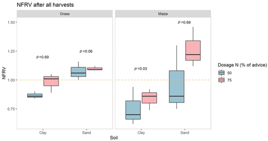 Figure 3 shows the NFRV results and significance test (a sign test of values combining the 75% and 50% treatments, but the crop–soil combinations were tested separately). The NFRV of AS was only significantly different from CAN for maize on clay, where it was 0.75 for the 50% dose and 0.84 for the 75% dose (standard deviations of 0.17 and 0.92, respectively). This is supported by similar results from the linear models, where the fertilizer showed an effect on maize N uptake, especially on clay soil.