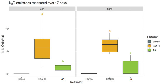 The N2O emissions from the field demonstration were much higher than the greenhouse experiment, which may be due to the wet weather in early April (cumulative precipitation and temperature in the month of April were 61 mm and 9.3 °C, respectively) that occurred at the time of fertilization and measurement, as wet weather facilitates N2O emission [28]. In this trial, a linear model was used to calculated the emissions. The fertilizer was found to have a significant effect on the emissions, namely that AS had significantly lower N2O emissions than CAN + S in both soil types (Figure 4).