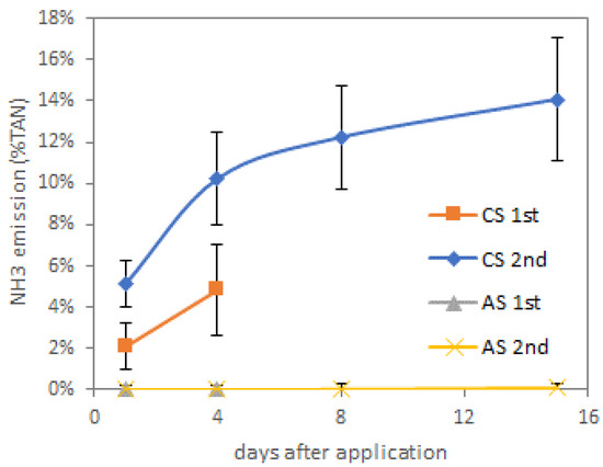 The cumulative NH3 emissions were measured in two experiments, as described in Section 2.4: 1st and 2nd, see Figure 5. The NH3 emissions from the cattle slurry (CS) in the 1st experiment were lower than in the 2nd experiment, while the temperature in the 1st experiment was also lower [11]. More relevant for these experiments are the very low emissions from the AS (<0.01% of TAN).