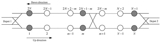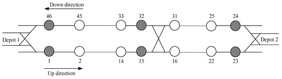 - Tan, B.B.; Jin, H.; Liu, S.; Chen, S.K. Optimization of Operation Organization for Large and Small Intersection Route Trains Considering Occupancy of Reversing Paths in Urban Rail Transit. J. Railw. Sci. Eng. 2022, 19, 2161–2168. [Google Scholar]