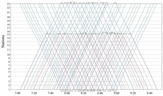- Zhang, X.Q.; Cui, B.M. Optimization and Compilation of Urban Rail Transit Co-Linear Route Timetables. J. Comput. Appl. Softw. 2016, 33, 248–251. [Google Scholar]