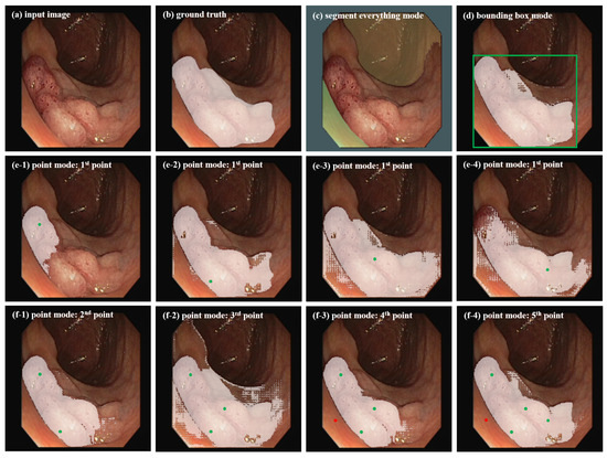 Considering the significant differences in target morphology, image format, and target region features between abdominal organ images and colonoscopy polyp images, we apply SAM with these three segmentation modes to colonoscopy polyp data to investigate whether the bounding box mode is the optimal choice for our segmentation task. Experimental results are shown in Figure 1. (1) Segment everything mode: This mode partitions the entire image into multiple regions based on image intensity by defining segmentation grid points (here using 9 × 9), but the segmentation results often lack semantic labels and cannot clearly focus on the ROI that clinical doctors care about, limiting its utility. In Figure 1c, it can be seen that, due to indistinguishable features between polyps and surrounding skin tissue, it is easy to regard the entire polyp area as background in this mode. (2) Bounding box mode: This mode segments the target objects by providing points for the lower right corner and upper left corner of the bounding box (in green in Figure 2d). In Figure 1d, it can be seen that this mode can better identify the polyp area and is more similar to the ground truth in Figure 1b. (3) Point mode: This mode generates the required mask by continuously adding foreground or background points. In Figure 1e1–e4, it can be seen that the segmented area with one point-prompt under this mode will change with the position of the point, leading to segmentation instability, and the contour of the target area does not converge. The target area will only approach the ground truth after repeatedly adding foreground and background points. In which, the green represents the foreground points, and the red represents the background points. Overall, the segmentation results with multiple point-prompts in Figure 1f1–f4 under the point mode are not as good as that in the box mode in Figure 1d. The point mode usually requires multiple prediction corrections and iterations, which is consistent with the conclusions of the study [9].
