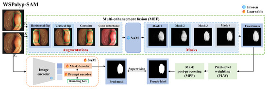 As a general segmentation foundation model, SAM faces challenges when employed in medical image segmentation, particularly in colonoscopy polyp segmentation. The inherent similarity between polyps and surrounding skin tissues, coupled with their indistinct boundaries, exacerbates the complexity of the segmentation task. Consequently, when weak annotation guides pretrained SAM in generating segmentation masks as pseudo-labels for the next precise segmentation, the resulting segmentation mask lacks precision due to these complexities. Employing imprecise segmentation masks as pseudo-labels not only fails to provide additional information but also may mislead the model and therefore could impede SAM’s fine-tuning. To address this challenge, we designed three techniques, i.e., multi-augmentation fusion, pixel-level weighting, and mask post-processing, to enhance the accuracy of ‘pseudo-labels’, especially in complex scenarios. For a detailed overview of the model architecture, refer to Figure 2.