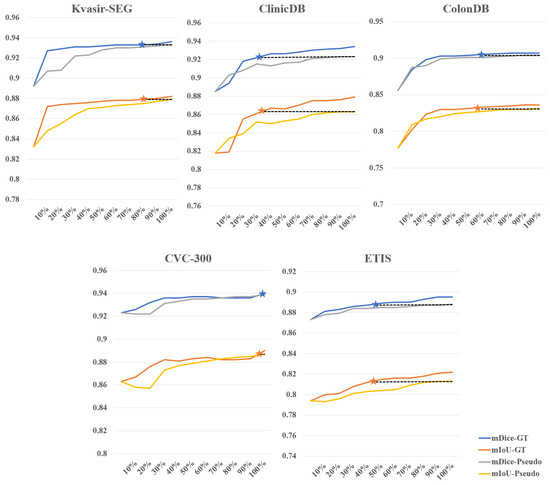 Effectiveness of weakly supervised fine-tuning in reducing annotation costs. We further investigated the impact of different amounts of training data for supervision masks on the results of fine-tuned SAM, fully demonstrating SAM’s efficiency in utilizing fine-tuning data. Figure 5 illustrates the comparison between weakly supervised and fully supervised approaches when the training data amount to between 10% and 100%, using the SAM-B model for fine-tuning. As the amount of data increases, the overall accuracy gradually improves. On the CVC-300 dataset, a weakly supervised strategy with 100% training data achieves results comparable to a fully supervised strategy with 90% to 100% training data. On the Kvasir-SEG dataset, a weakly supervised strategy with 100% training data achieves results comparable to a fully supervised strategy with 80% training data. On the ColonDB dataset, a weakly supervised strategy with 100% training data achieves results comparable to a fully supervised strategy with 50% training data. However, performance is relatively poorer on the other two datasets. On the ETIS dataset, a weakly supervised strategy with 100% training data achieves results comparable to a fully supervised strategy with 40% to 50% training data. On the ClinicDB dataset, a weakly supervised strategy with 100% training data only achieves results comparable to a fully supervised strategy with 20% to 30% training data. Overall, using 100% training data under the weakly supervised strategy achieves 56% to 62% of the training results of fully supervised learning. We simulated the scenario of annotating polyp data and found that the time ratio between bounding box annotation and rough pixel-level annotation is approximately 1:6 (which would be even higher if precise pixel-level annotation is done by professional annotators). Based on this calculation, for example, if bounding box annotation takes 1 s and pixel-level annotation takes 6 s, to achieve the training data results of 56% to 62% under fully supervised learning with 100 images, the annotation time ratio would be approximately 27% to 30%, saving 70% to 73% of the time cost. This demonstrates the effectiveness of our method in reducing annotation costs.