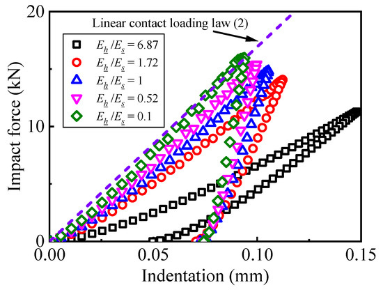 From Figure 10, it can be seen that the predictions by the new linear contact loading law (10) match the finite element calculations. The predicted values of the maximum impact forces are calculated by using the linear contact loading law (10) based on the indentation at the unloading moment of the finite element. The comparison between the predicted values and the finite element calculation results is shown in Table 6, with a maximum error of 11% and an average error of 4.3%.