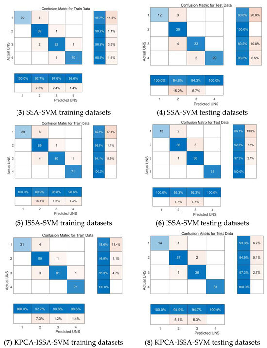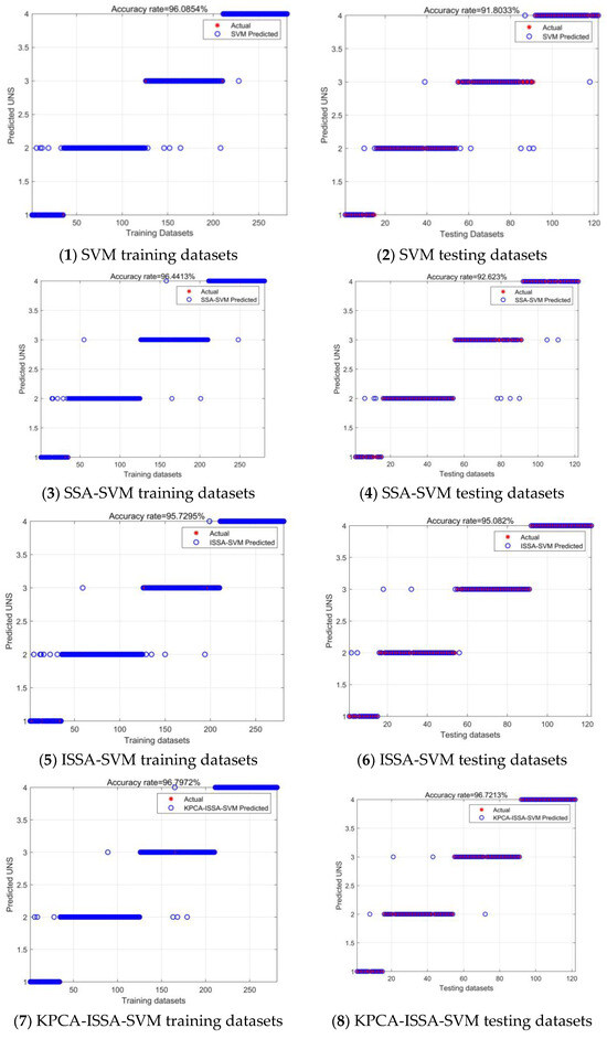 - The prediction accuracies of the four models can be found. The results of the SVM model training stage produced an overfitting phenomenon, and the accuracy values of the training stage and test stage were 96.0584 and 91.8033, respectively. However, as the complexity of the composite model increased, the problem of overfitting was solved. The accuracy values of the KPCA-ISSA-SVM model in the training stage and test stage were 96.7972 and 96.7213, respectively. Therefore, improving the complexity of the model can effectively reduce the phenomenon of underfitting or overfitting;