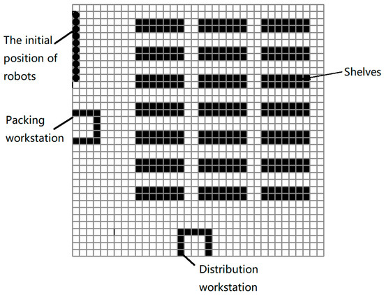 The grid model of the e-commerce logistics and warehousing system is established using the grid method [32]. Figure 2 illustrates the e-commerce logistics and warehousing system comprising robots, packaging workstations, distribution workstations, and shelves. Robots are free to move in the aisles between the shelves, with one staff member at each workstation, and robots can transport shelves to different workstations for packaging and distribution tasks.