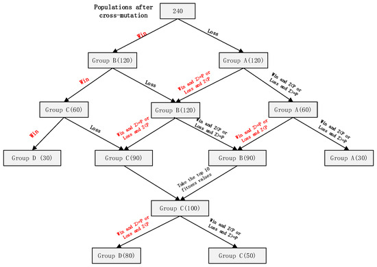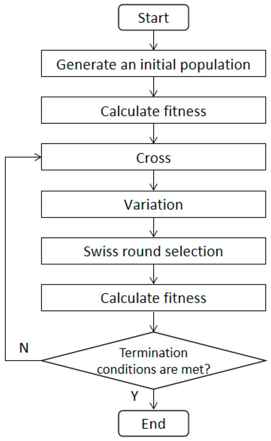 The Swiss Round Selection Algorithm is inspired by the Swiss system tournament format used in chess championships. The main idea of the algorithm is to expand the search range of the population through full crossover and full mutation operations, followed by a Swiss Round Selection operation with a cold explosion probability for population screening. This screening method ensures that high-quality individuals successfully advance to the next generation while maintaining the diversity of the population, thereby enhancing the algorithm’s rapid global search capability. The flowchart of the algorithm is depicted in Figure 3.