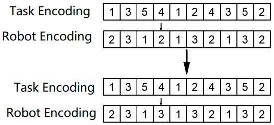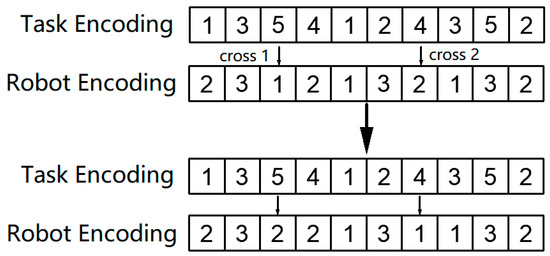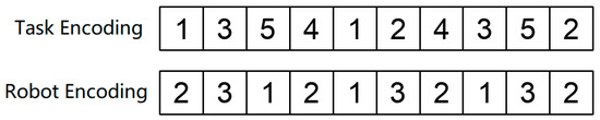 Chromosome encoding uses a dual-chromosome encoding method, with one chromosome for task encoding and the other for robot encoding. Both task encoding and robot encoding use real-number encoding, and the chromosome length is twice the total number of tasks to be performed. In the task chromosome encoding, each task gene appears twice. The first occurrence represents the execution of the first phase (P1) packaging task, and the second occurrence represents the execution of the second phase (P2) distribution task. The order of the task encoding from left to right represents the sequence in which tasks are to be executed, while the robot chromosome encoding indicates the robot numbers corresponding to the sequence of tasks to be executed. For example, with five tasks and three robots, the encoding of a certain chromosome is presented in Figure 4.