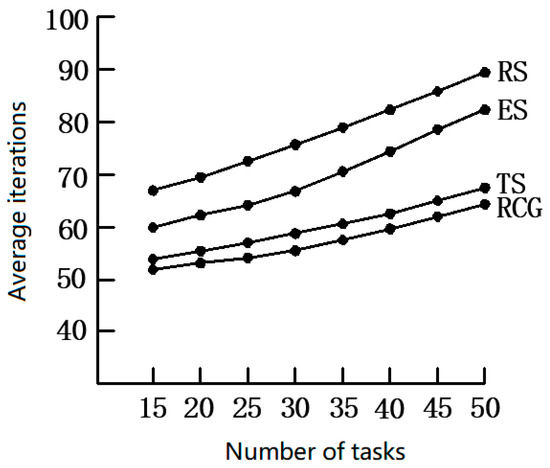 Figure 8 reveals that under different task quantity conditions, the number of iterations required for RCG to reach the optimal value is superior to other algorithms. The experimental results indicate that the RCG algorithm outperforms other algorithms regarding solution speed and convergence capability.