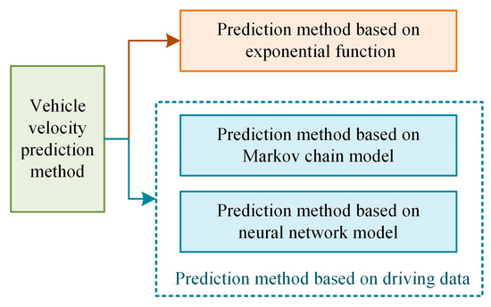 At present, the prediction methods of future vehicle velocity mainly include the prediction method based on exponential function and the prediction method based on driving data [2,3]. The different methods of vehicle velocity prediction are shown in Figure 1.