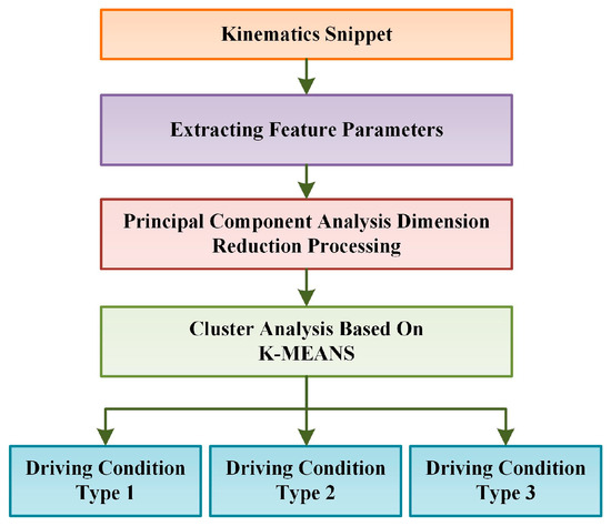 The sample acquisition process is shown in Figure 2. The kinematic segments of typical driving conditions are extracted, and a multi-feature kinematic segment clustering method based on principal component analysis is proposed. The multi-feature parameters of the kinematic segments were reduced dimensionality according to the principal component analysis method, and the kinematic segments with similar feature parameters were clustered together by the K-means algorithm to obtain the training samples of the sub-models of velocity prediction under three working conditions to prepare for the subsequent velocity prediction.