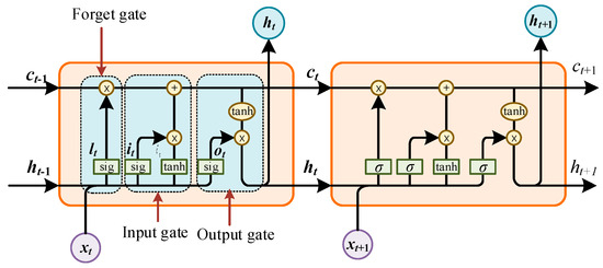 The LSTM cell diagram is shown in Figure 4. In the LSTM cell diagram, x = [x1, x2, x3, ..., xt+1], t is the time step, xt is the input at time t, h = [h1, h2, h3, ..., ht+1], ht is the corresponding output at time t, c = [c1, c2, c3, ..., ct+1], and ct is the corresponding state of time t memory cells. Cell state is the memory unit of LSTM, carrying all previous state information [34]. Compared with the RNN unit structure module, the LSTM unit structure module is more complex and has more parameters.