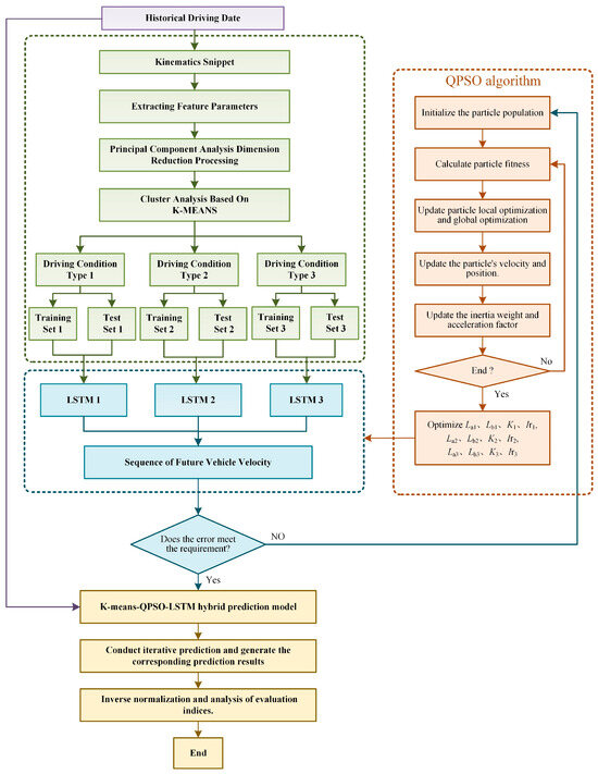 Based on the above analysis, the same driving conditions often have similar velocity fluctuation trends. In order to further improve the prediction accuracy of vehicle velocity, a hybrid model of clustering data with LSTM-NN was proposed. Firstly, kinematic fragment samples in typical working conditions were extracted and feature parameters were calculated. Principal component analysis was used to reduce the dimensionality of feature parameters with multiple dimensions, and samples with similar characteristics were clustered by the K-means algorithm. The clustering results could effectively express the historical correlation and trend correlation of vehicle velocity in various working conditions. Then, the LSTM model was trained by using the training data obtained by clustering, the number of neurons, training times, and learning rate of LSTM-NN were optimized by quantum particle swarm optimization algorithm (QPSO), and the K-means-QPSO-LSTM prediction model was constructed for prediction. Finally, a China Heavy-duty commercial vehicle Test Cycle-Tractor Trailer (CHTC-TT) was used as the test cycle. The hybrid prediction model based on K-means-QPSO-LSTM was compared with radial basis function (RBF)-NN and CNN-LSTM, which are commonly used in vehicle velocity prediction.