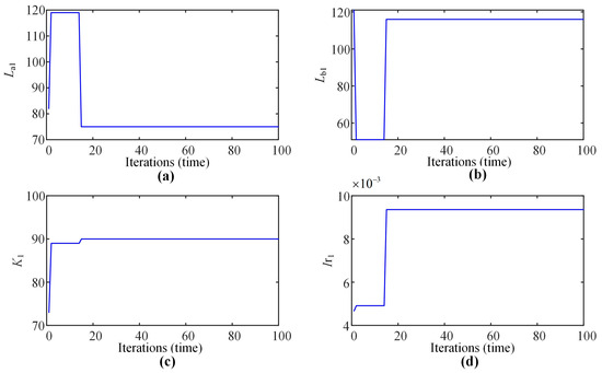 The change in the QPSO hyperparameters with iteration times for LSTM 1. (a) La1 changes with the number of iterations, (b) Lb1 changes with the number of iterations, (c) K1 changes with the number of iterations, (d) Ir1 changes with the number of iterations.