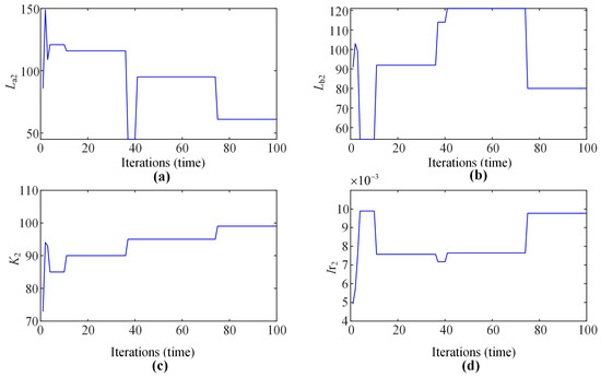 The change in the QPSO hyperparameters with iteration times for LSTM 2. (a) La2 changes with the number of iterations, (b) Lb2 changes with the number of iterations, (c) K2 changes with the number of iterations, (d) Ir2 changes with the number of iterations.