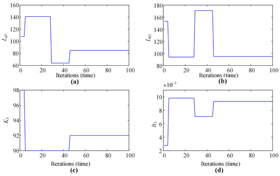 The change in the QPSO hyperparameters with iteration times for LSTM 3. (a) La3 changes with the number of iterations, (b) Lb3 changes with the number of iterations, (c) K3 changes with the number of iterations, (d) Ir3 changes with the number of iterations.