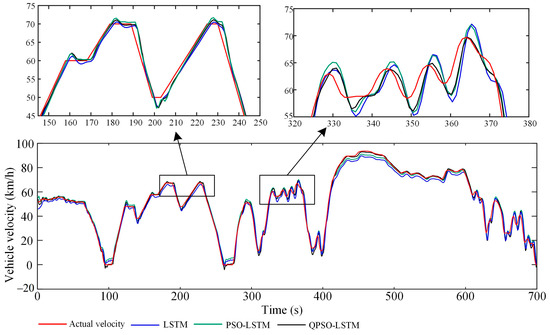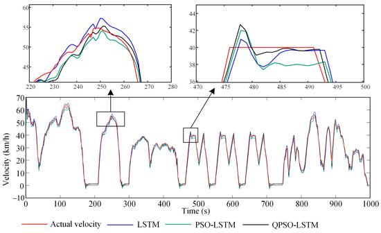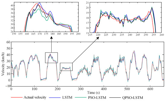 From Figure 12, Figure 13 and Figure 14, it can be seen that when the vehicle velocity was steady (i.e., there is no sudden increase or decrease in acceleration), the prediction accuracy of the vehicle velocity was more accurate, as was the prediction accuracy of the QPSO-LSTM method. In summary, the QPSO-LSTM algorithm’s vehicle velocity prediction performance was better than that of the single LSTM algorithm and the PSO-LSTM algorithm’s vehicle velocity prediction effect. When the prediction horizon was 2 s, the trend and numerical size of the predicted vehicle velocity were almost consistent with the actual vehicle velocity, and the predicted vehicle velocity was more consistent with the actual vehicle velocity curve. Only at the turning points of the vehicle velocity did the prediction error increase.