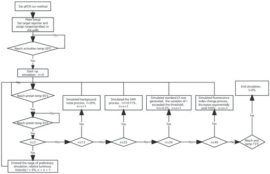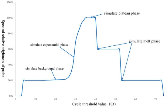 According to Equation (2), in actual PCR reactions, a typical amplification process follows an S-shaped curve, including the background phase, exponential amplification phase, and plateau phase. Based on this theory, the calibration device can control the standard light source within the probe based on temperature changes collected by the temperature acquisition module. This control ensures that the light emission intensity changes according to a predefined process, simulating the brightness changes of fluorescence groups during the amplification reaction. The simulated fluorescence is received by the qPCR instrument to mimic a typical amplification curve. The controller of the calibration device drives different electric current levels to the fluorescence output module of probes, resulting in varying intensities of fluorescence brightness. Specifically, during the initial stage, it simulates the background phase by causing only minimal changes in standard light source emission, resulting in growth below a certain threshold. In the second stage, it simulates the exponential amplification phase by causing a fluorescent brightness change that follows an exponential pattern after subtracting background noise. And, during the beginning of this phase, it simulates the pre-set Ct value. This means that when the number of cycles corresponding to this Ct value is reached, the standard light source’s emission undergoes a slight increase just enough to surpass the threshold and be detected by the qPCR instrument. In the third stage, it simulates the plateau phase where standard light source emission gradually reaches 100%. After completing simulation of an S-shaped curve representing amplification, the probe can also be designed to simulate the melting curve process by emulating half DNA denaturation-induced fluorescence and reducing standard light source emission by equal magnitude. The designed simulated fluorescence process is illustrated in Figure 2.