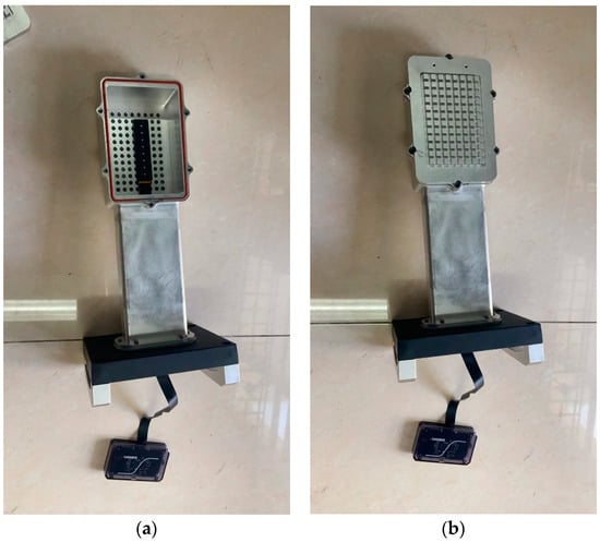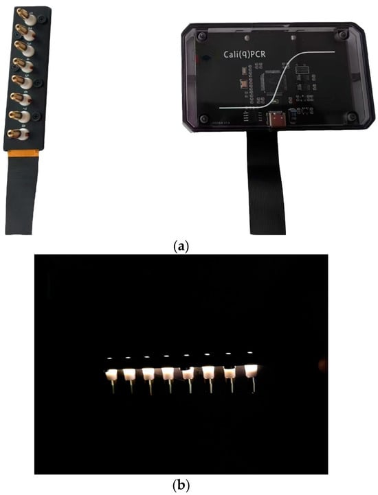 There are eight 2 mm diameter transparent holes on the upper cover plate, while the bottom plate, i.e., the circuit board, contains through-holes allowing the probes to pass through. The top of probes is designed with irregular nested shapes to fit between the upper cover plate and the bottom plate, ensuring that the light emission position of the standard light source precisely aligns with the translucent point. This alignment guarantees that the emitted light from the standard source can be captured by the qPCR instrument during the actual calibration process, and the collected fluorescence data automatically generate measured amplification curves. The optical part of the probe was machined separately using the PTFE rods and then assembled with the temperature part. The heated top cover plate on the qPCR instrument, typically operating at temperatures between 90 °C to 105 °C, allows the calibration device to continuously operate at high temperatures. To achieve this, the top cover plate undergoes multiple high-temperature aging processes to ensure that it remains unaffected by temperature-induced deformation during actual use. The top cover plate features a hollow design, allowing the protruding components of the circuit board to be embedded within it. The top cover plate and bottom plate are secured by four position screws, effectively reducing the thickness of the calibration device’s substrate and enabling it to accommodate various types of qPCR instrument for detection. The physical appearance of the calibration device is shown in Figure 5.