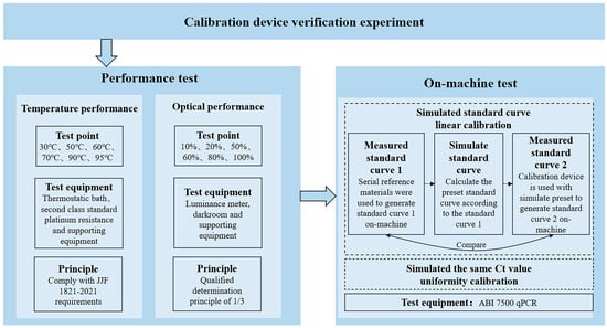 In this calibration device the optical part uses PTFE, with the expansion coefficient being (25~250 °C) of 10~12 × 10−5/°C, thermal conductivity being 0.19~0.25 W/m·K, and refractive index being 1.37 (20 °C). The optical part uses 30% glass fiber reinforced poly ether ether ketone (PEEK) with tensile strength being 115 MPa at 125 °C, flexural strength being 190 MPa at 125 °C, and thermal conductivity being 0.35 W/m·K. This paper conducted temperature performance tests and optical performance tests on the developed calibration device, ensuring that its technical specifications meet the requirements for qPCR instrument calibration. Subsequently, on-machine tests are employed to validate the feasibility of the calibration device’s simulation of standard curves for implementing linear calibration schemes on qPCR instruments, along with its applicability for calibrating uniformity of qPCR instruments. The experimental design is illustrated in Figure 6.