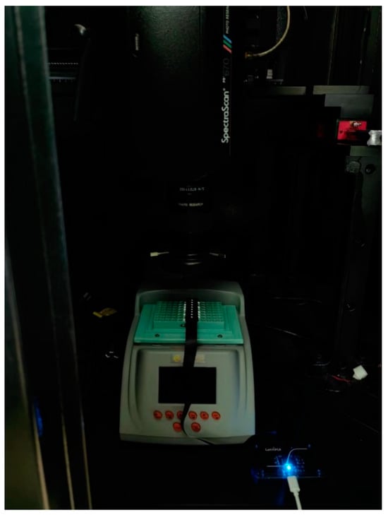 Furthermore, the increasing use of multiplex qPCR instruments for detection has led to a need for multiple fluorescence channels to be utilized simultaneously in order to detect multiple targets and improve detection efficiency. However, this also necessitates the calibration of all fluorescence channels of qPCR instruments [], typically requiring costly and complex configurations with standard substances containing multiple fluorescent probes. The device developed in this study utilizes LEDs as the standard light source, enabling full-spectrum optical simulation and calibration of different fluorescence channels of the PCR instrument through selection via the device’s filters. This approach not only reduces costs but also offers good reproducibility while achieving simultaneous calibration of multiple channels, thereby saving time and improving overall calibration efficiency. The device provides robust assurance for the application of PCR instruments in molecular biology research. Through performance testing and comparative on-site experiments, we have demonstrated that this calibration device can serve as an alternative method with superior capabilities compared to traditional biochemical approaches, indicating its significant potential for future applications in research settings.