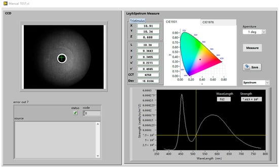 The optical performance testing utilizes a fully automated optical calibration device consisting of a darkroom, spectrometer, a three-axis drive system, and a positioning module. The spectrometer (PR-670) has a luminance measurement range of 0.1 to 1000 cd/cm2 and a wavelength measurement range of 360 to 780 nm. It is traceable to national standards and meets relevant specifications. The testing site is shown in Figure 8. We first adjust the spectrometer and guide rail to be level, then adjust the three-axis structure so that the lens of the spectrometer is aligned with the light emitting point of the probe being tested on the same vertical axis. Next, we adjust the distance from the spectrometer lens to the light emitting point to ensure that the center of the spectrum spot coincides with the transmissive point of emitted light under test. We individually adjust the relative brightness of each probe to 10%, 20%, 50%, 60%, 80%, and 100%. We use the spectrometer to test the brightness values of each probe under these six relative luminance conditions, as shown in Figure 9. Linear regression was performed between the relative emission percentages and the measured luminance values, and the linear regression coefficient (r) was calculated as the linear result of the emission light source, as presented in Table 3. The factory linear requirement for qPCR instruments is generally r > 0.997. Typically, the maximum allowable error of measurement standards should not exceed 1/3 of the maximum allowable error of the measured object. The linearity of the calibration device should meet a requirement r ≥ 0.999, and it has been confirmed that this developed calibration device meets this criterion.