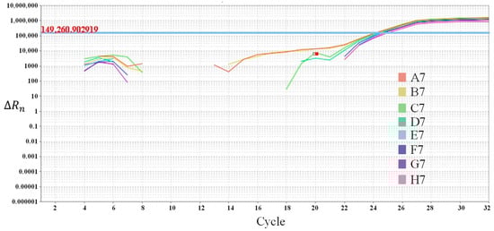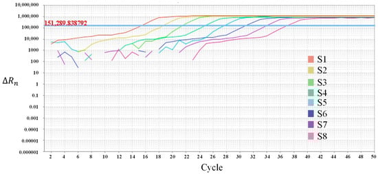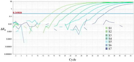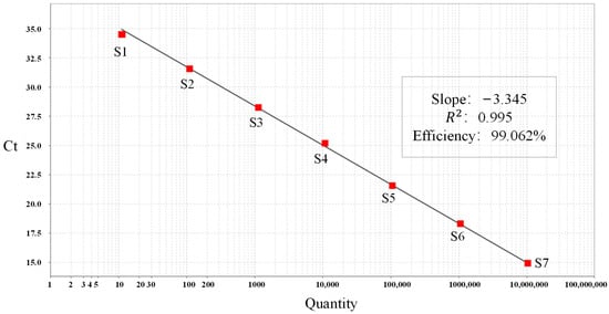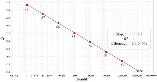 The amplification results of the standard substances are shown in Figure 11, and the results are presented in Table 5. A standard curve for standard substances is plotted with the logarithm of the concentrations of the standard substances as the x-axis and the Ct values corresponding to each standard substance as the y-axis, as shown in Figure 12, which was automatically generated by the 7500 qPCR instrument. The regression coefficient representing sample linearity was calculated according to Equation (3). The linear correlation obtained was r = −0.9975 (R2 = 0.995). Sample linearity characterizes how closely the regression line of a standard curve fits with Ct values of standards, indicating a high degree of fit between them; when r = 1, it indicates a perfect fit between the regression line and the data points [].