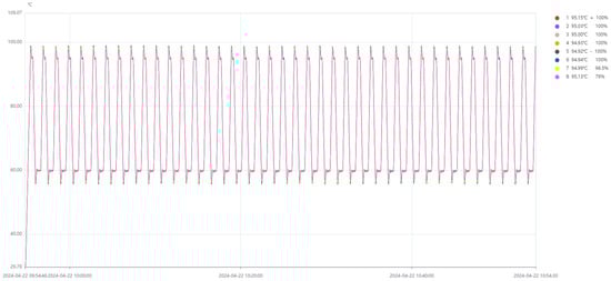 Ct values are inversely correlated with the initial viral load and can indirectly quantify the initial viral copy number []. Therefore, by simulating different Ct values for each probe of the calibration device and varying the light emission accordingly, the simulation of a series of diluted standard substance curves can be achieved. When the eight probes of the calibration device simulate different Ct values, each probe only needs to sequentially generate optical changes, as shown in Figure 2, according to the set Ct value steps successively. In order to simulate a Ct value such as 24, the temperature acquisition control process for light emission variation by this probe is illustrated in Figure 3. Additionally, probes can also simulate the fluorescence of negative control by maintaining a constant low level of emission (e.g., I = 20%).