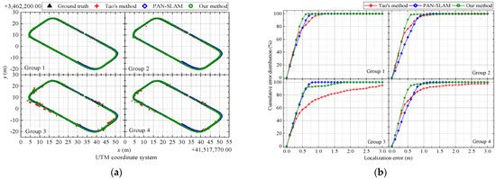 The results of the metric localization for our method and the comparison methods are presented in Table 6. Figure 12 shows the comparison of the localization trajectories and the cumulative error distribution between the three methods in the industrial park’s underground parking scene, while Figure 13 displays the same data for the mall’s underground parking scene.