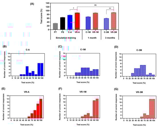 3.5. VR-Assisted Teaching Can Improve Students’ Learning Effectiveness (Pre-Test, Same Day Post-Test, after 1 Month, and after 3 Months)