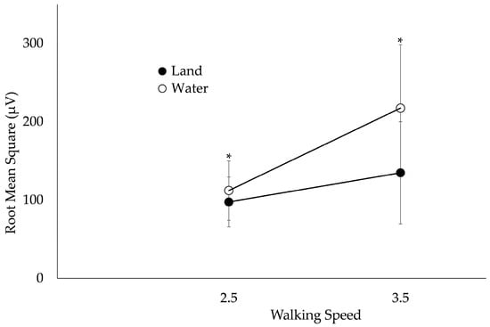 Statistical analysis was performed using RStudio (Version 1.1.456). Intraclass correlation coefficients (ICC) and corresponding 95% confidence intervals (95% CI) were used to evaluate the inter-trial reliability of sEMG measurements. ICCs were estimated from a single measure, absolute agreement, two-way mixed effects model. ICC values were classified as excellent reliability (>0.90), good reliability (0.75–0.90), moderate reliability (0.50–0.75), or poor reliability [34]. Prior to hypothesis testing, we confirmed the normality of the data using the Shapiro–Wilk test. For all dependent measures, the main effects and interactions between environment (land × water) and walking speed (2.5 mph × 3.5 mph) were evaluated using a two-way within-subjects analysis of variance (ANOVA). Post hoc analysis of significant interactions was performed using Tukey HSD pairwise comparisons. Post hoc analysis of the main effects was performed using paired t-tests. For the supplemental analysis, differences between walking in water at 3.5 mph with and without 75% jet resistance were evaluated using paired sample t-tests. Cohen’s d-effect sizes were estimated using mean differences and pooled standard deviations. The interpretation of Cohen’s d values followed an established scale from the literature [35]. All hypothesis tests were conducted using an alpha-type I error threshold of 0.05.