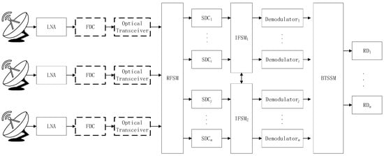 Satellite data reception requires the arrangement of antennas, channel subsystem links, and recording equipment in the data processing subsystem. The channel subsystem links include the first DC (FDC), a LNA, the second DC (SDC), and a demodulator []. The three hardware devices are connected by a radio frequency switch matrix (RFSM), intermediate frequency switch matrix (IFSM), and baseband three-stage switch matrix (BTSSM). A typical ground station receiving system structure is shown in Figure 1.
