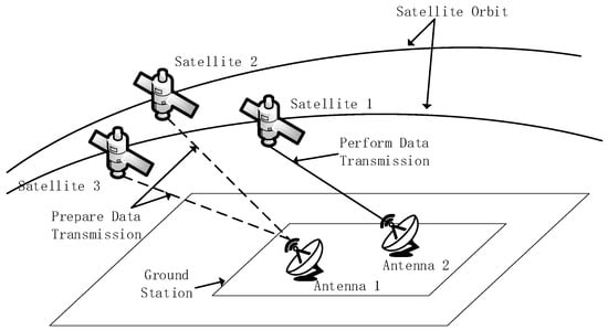 In recent years, technological advancements in aerospace engineering have led to a rapid increase in the number of remote sensing satellites. This expansion has resulted in a substantial surge in data transmission tasks and the associated volume of data [], straining the existing ground station infrastructure beyond its capabilities. Despite the surge in satellite data, the hardware resources of most ground stations have not undergone commensurate upgrades, thus exposing the shortcomings of traditional scheduling methods in managing burgeoning resource allocation demands. These conventional approaches are increasingly inadequate, frequently failing to efficiently allocate finite hardware resources, which gives rise to significant bottlenecks and impedes timely data reception. Consequently, there is an imperative need to develop and implement innovative strategies that enhance data reception processes considering the existing hardware resource limitations []. Tackling this challenge is pivotal to improving the overall efficacy and dependability of satellite data transmission systems.