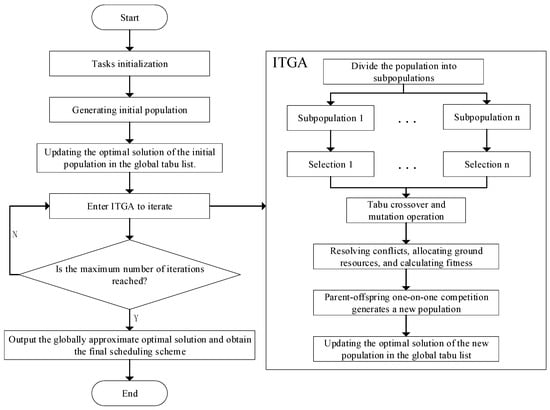 In summary, we propose an ITGA combined with heuristic rules. Firstly, the data transmission task set is divided into non-conflicting sub-task sets using a divide-and-conquer approach. Secondly, initial chromosomes representing the execution order of the data transmission tasks are randomly generated, and the allocation of ground station hardware resources is determined based on this order to calculate the fitness values of these chromosomes. In the ground station’s hardware resource scheduling, the algorithm combines a conflict resolution method based on heuristic rules with the ground station’s resource allocation method. Data transmission tasks that cannot be executed due to conflicts are pruned in order to enhance both the overall quality of the initial population and individual chromosome quality during iterations. By combining the tabu search algorithm (TSA) with the GA, improvements are made to traditional mutation and crossover operators, preventing repeated searches and avoiding local optimal solutions while considering constraints related to ground station resources. Consequently, an optimal solution for allocating hardware resources in satellite data transmission ground stations is obtained, which has been verified through experiments demonstrating its effectiveness and reliability.