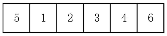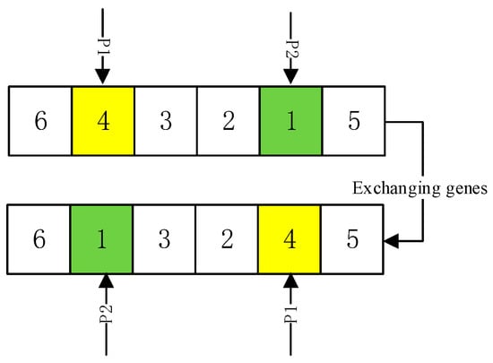 After obtaining the offspring population through crossover operations, mutation operations are performed on the offspring population according to the mutation probability. In this paper, the swap operator is used for chromosome mutation. The operation steps are as follows: two gene positions, P1 and P2, are randomly selected on the chosen chromosome, and the genes corresponding to these positions are swapped to obtain a new chromosome. The operation process is shown in Figure 8.