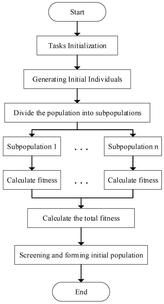 The GA is an intelligent search algorithm with excellent performance []. However, when dealing with large-scale problems, due to its inherent disadvantages, such as slow convergence speed and susceptibility to getting trapped in locally optimal solutions [], the GA often struggles to ensure efficient solution finding. Therefore, we propose combining the TSA with the crossover and mutation operators in the GA to form improved crossover and mutation algorithms that can enhance the efficiency of the GA in finding solutions. The execution flow of the improved tabu genetic hybrid algorithm is illustrated in Figure 4.