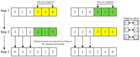 The process of selecting two populations as parent populations using the TS method and performing crossover operations with crossover probability rc is as follows: Firstly, two parent chromosomes are selected from each of the two parent populations. Secondly, two target points are randomly chosen, and the sequences between these two target points in the two parent chromosomes are swapped. Through a mapping approach, duplicate chromosomal genes are avoided, ensuring that the newly generated offspring chromosomes also adhere to the encoding rules. Finally, the two generated offspring chromosomes are added to the offspring population. This crossover operation is repeated for the parent populations until the offspring population is fully generated. The crossover operation process is illustrated in Figure 7.