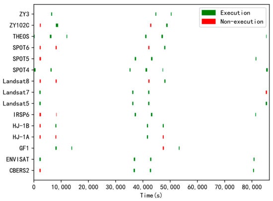 The figure illustrates the task schedule for satellites over a 24 h period, with the x-axis representing time of day in seconds and the y-axis denoting satellite names. The small squares in the graph represent the individual tasks assigned to each satellite throughout the day. Red squares indicate tasks that were not executed due to an unsuccessful allocation of ground station hardware resources, while green squares represent tasks that were successfully allocated resources and executed.