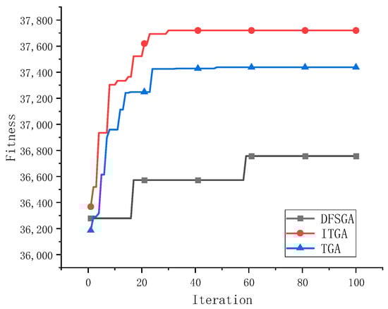 As shown in the ACG metric comparison chart, the GA enhanced with DFS partially addressed the issue of slow convergence due to its weak local search capability. However, its convergence speed is still slow compared to the TGA and the ITGA. Both the TGA and the ITGA achieve convergence within 60 generations, with the ITGA exhibiting a 54.56% reduction in average convergence generations. This demonstrates that the ITGA can converge more rapidly, as illustrated in Figure 11.