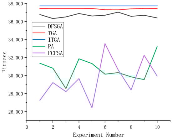 Additionally, as illustrated in Figure 12, the ITGA algorithm was able to identify the ground station hardware resource scheduling scheme with the maximum total fitness value in all ten experiments of Case 2. It also performed better than the DFSGA and the TGA in terms of the ANCT metric. Both the FCFSA and the PA exhibited unsatisfactory stability performance. In summary, the ITGA’s stability performance is superior to that of other algorithms.