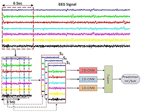 The limitations of traditional machine learning techniques and the outstanding performance of deep learning in various applications motivated the use of deep learning for schizophrenia detection, and many deep learning-based techniques have been proposed [11,12,13,14,15,16]. The performance of these techniques is good; they are prone to overfitting because they have highly complex architectures involving a large number of learnable parameters, but the available data for schizophrenia detection are limited. To overcome these problems, there is a need for a robust method that is based on a lightweight deep learning-based model, which involves a small number of learnable parameters so that it can be learned with limited data, avoiding overfitting. Motivated by the ensemble learning approach, we propose an ensemble-like method to scan EEG signals for the detection of schizophrenia. We propose a lightweight 1D CNN model based on deep learning theory as a backbone model for this method. Its simple architecture involves a few learnable parameters and can be trained with limited data. It automatically learns and extracts discriminative features relevant to schizophrenia. Though the proposed lightweight 1D CNN involves a small number of parameters, it needs enough data to learn these parameters and avoid overfitting, but the available dataset is very small. To tackle this issue, we introduce a simple data augmentation scheme that creates EEG trials from the available limited dataset.