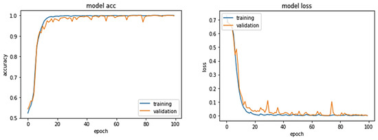 The number of epochs was set to 100. The Keras checkpoint function was used to save the weights that give the best validation accuracy to use later for testing. The parameters of the Adam optimizer were set to their default values provided by Keras, which are 0.001 for the learning rate, 0.9 for beta-1, and 0.999 for beta-2. The curves mentioned in Figure 4 indicate that the backbone model does not suffer from overfitting and has good generalization. These curves demonstrate that our model achieves a consistent reduction in loss and stabilization in accuracy, which do not diverge significantly between training and validation. This is a strong indicator that our model is not overfitting.