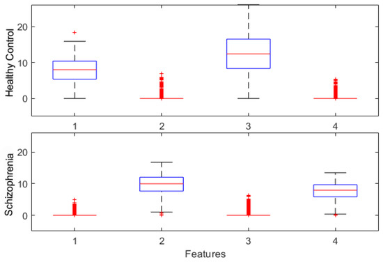 To investigate the effect of each extracted feature on detecting schizophrenia, we present box plots, as shown in Figure 6. The box plots presented in Figure 6 show that the first and third features greatly affect the detection of normal controls. However, the same two features have zero means in the case of schizophrenia, which means they have no effect on detecting the disease. For the second and fourth features, we noticed that they do not affect detecting normal controls, but they have a high effect on detecting schizophrenia.