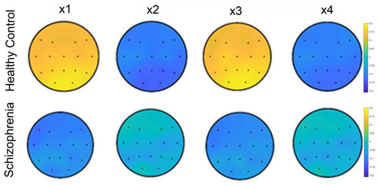 Figure 7 shows the effect of each extracted feature on EEG signals. As shown, the first and third features are highly correlated with the signals of normal subjects, especially in the occipital brain region, but they are negatively correlated with the signals of schizophrenics. On the other hand, the second and fourth features are negatively correlated with normal signals, and they have a less negative correlation with signals of schizophrenia subjects, especially in the frontal and occipital brain regions. It is important to note that alterations in certain EEG frequency bands, particularly beta and gamma, have been previously reported in schizophrenia. These changes are believed to reflect underlying dysfunctions in cortical connectivity and neuronal synchronization, which are critical in the pathophysiology of schizophrenia.