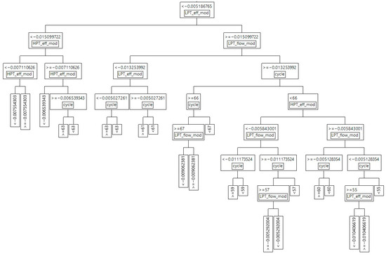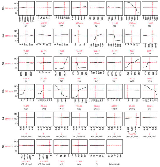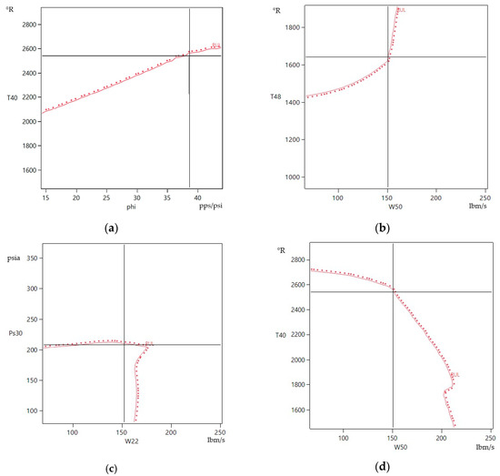 The components that exhibit a consistent decrease are the fan, low pressure compressor (LPC), high pressure compressor (HPC), low pressure turbine (LPT), and high-pressure turbine (HPT). The simulation of deterioration effects involves the modification of the flow capacity and efficiency of the engine sub-components, which are denoted by the engine health parameters . The given quantity of hyperbolic tangent boosted nodes is three, while a sequence of models that are additive in nature and scaled by the boosting learning rate is set to 0.1. The penalty method is mathematically defined as the square of a certain value, where the number of iterations is fixed at one. Figure 5 presents visual depictions of the highest rated response contours for pairs of variables, obtained by extracting notable positive and negative features through profiler manipulation. The interactive contour profiling capability is used to visually improve response surfaces. Every contour is accompanied by a dashed line that shows the direction of higher response values, giving a distinct indicator of orientation.